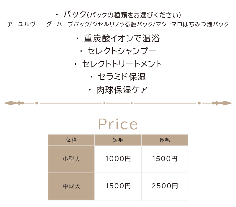 | ・爪切り・耳そうじ・肛門線しぼり ・趾裏、趾まわりカット・肛門まわりカット が含まれています。 >>>犬種別料金 |