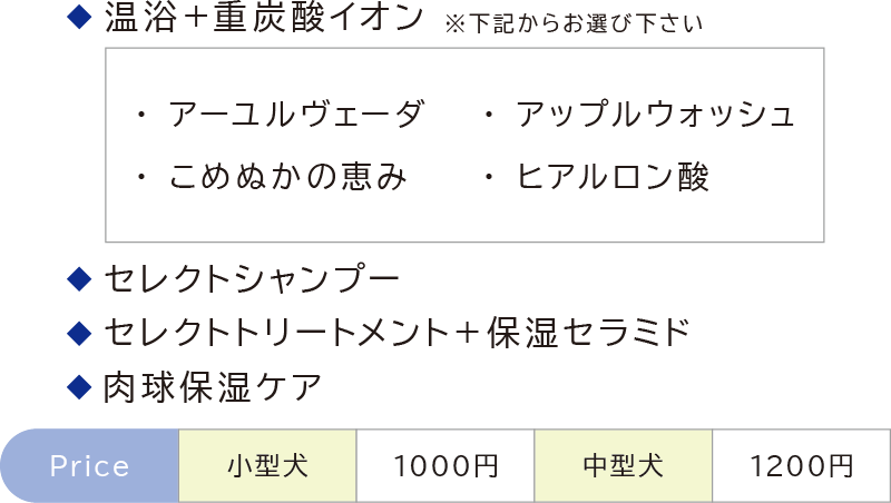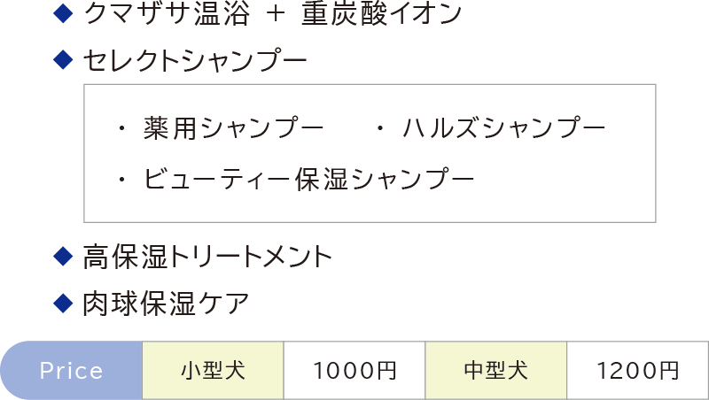 | ・ 前回トリミングコース・シャンプーコースご利用から15日以内限定 ・ コース・シャンプー、ブロー・耳そうじ・趾裏バリカンのみ ・ シャンプーコース料金より 1000OFF >>>犬種別料金 |