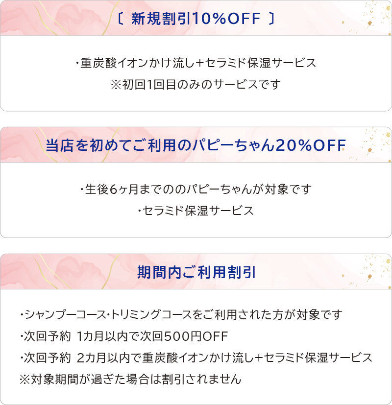 | ・ 前回トリミングコース・シャンプーコースご利用から15日以内限定 ・ コース・シャンプー、ブロー・耳そうじ・趾裏バリカンのみ ・ シャンプーコース料金より 1000OFF >>>犬種別料金 |